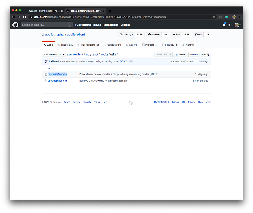 I’m going to showcase an example. For this example, I’m going to dive into Apollo’s useQuery hook. I haven’t used Apollo for almost six to seven months now, and I haven’t dug into apollo-client before, so this is my first time.